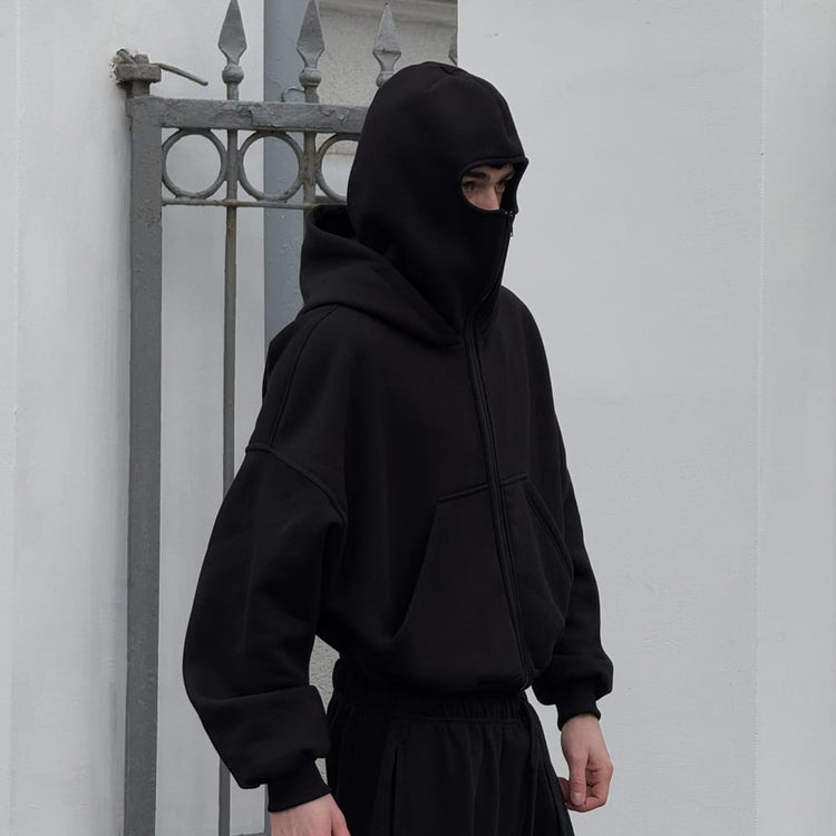Discover the ultimate warmth of our No Face hoodie, crafted from heavyweight 470 GSM fleece for cozy comfort. With an integrated balaclava and durable stitching, it’s your winter must-have.